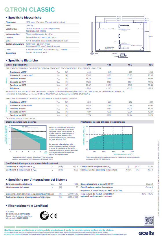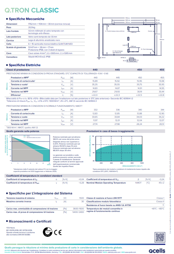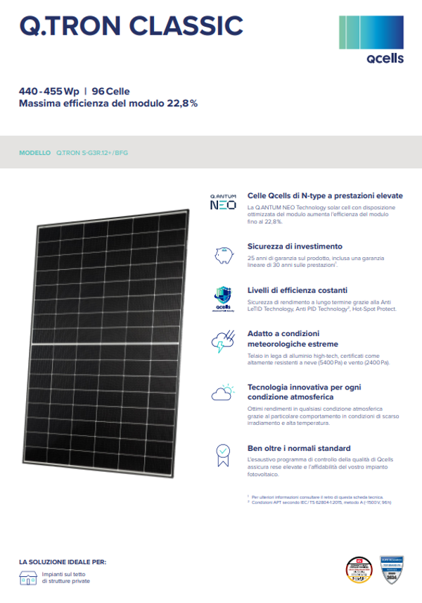 Modulo fotovoltaico bifacciale con doppio vetro con una potenza di 445 Watt monocristallino 96 celle N-Type monocristalline Q.ANTUM NEO. Garanzia sui difetti di prodotto 25 anni.